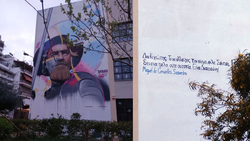 Πάνω στο τοίχο του 52ου δημοτικού σχολείου. Δον Κιχώτης και Θερβάντες.