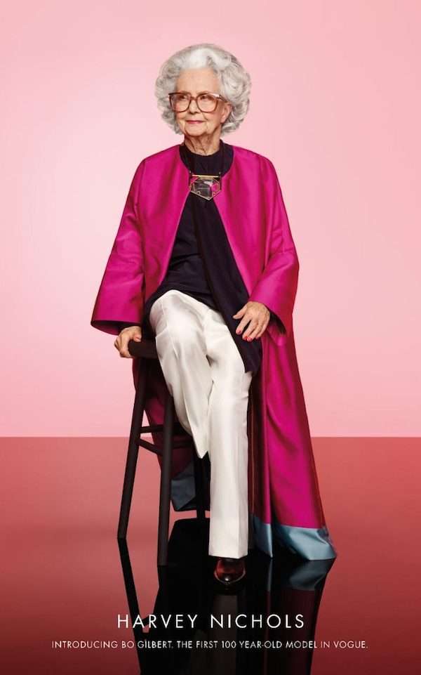 Γεννημένη στις 12 Ιανουαρίου του 1916 η Majorie Gilbert, γνωστή ως Bo. Δεν είχε προηγούμενη εμπειρία σαν μοντέλο αλλά χρησιμοποιήθηκε από το περιοδικό British Vogue στο εορταστικό τέυχος του για τα 100 χρόνια του περιοδικού. Και τι καλύτερο να γιορτάσει το περιοδικό τα 100 χρόνια του, από το έχει σαν μοντέλο μιά κυρία 100 χρονών.