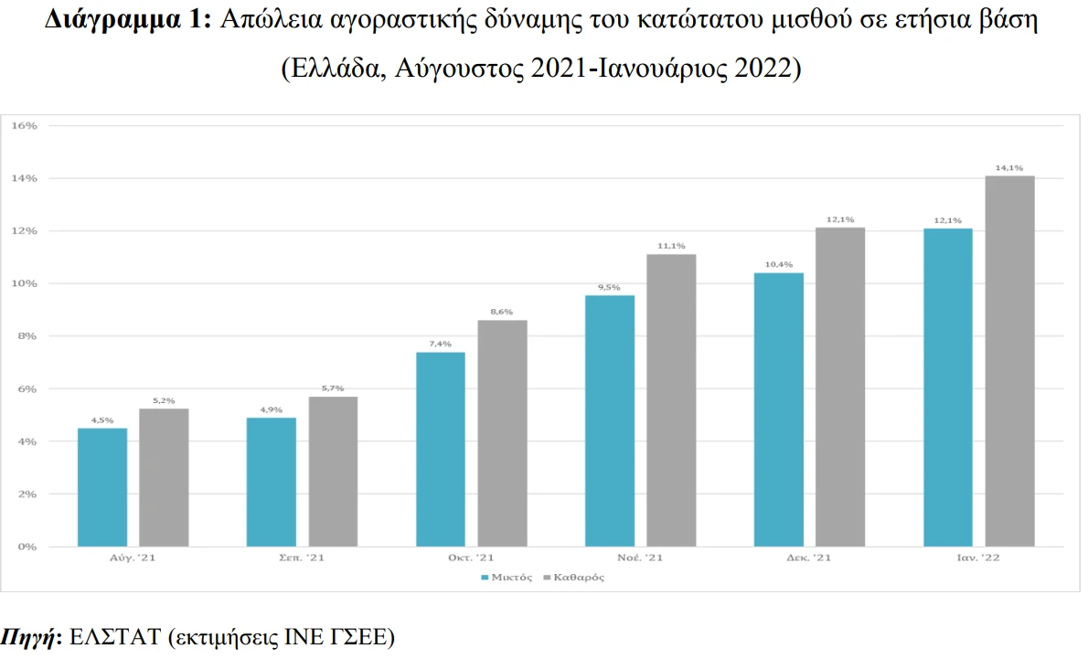 το Διάγραμμα 1 παρουσιάζει την απώλεια της αγοραστικής δύναμης του κατώτατου μισθού. Όπως έχουμε ήδη τονίσει (ΙΝΕ ΓΣΕΕ, 2022), το κύμα ακρίβειας οδηγεί σε διαρκή μείωση της αγοραστικής δύναμης του κατώτατου μισθού, η οποία από 4,5% τον Αύγουστο του 2021 ανήλθε τον Δεκέμβριο σε 10,4%. Τον Ιανουάριο του 2022, η προγραμματισμένη μικρή όσο και καθυστερημένη αύξηση του κατώτατου μισθού κατά 2% περιόρισε σε μικρό βαθμό την απώλεια αγοραστικής δύναμης, η οποία όμως ανήλθε τελικά σε 12,1%. Η αύξηση του κατώτατου μισθού περιόρισε την απώλεια αγοραστικής δύναμης μόλις κατά 0,2%, αφού χωρίς αυτήν η απώλεια αγοραστικής δύναμης θα ήταν 12,3%. Όμως, οι υπολογισμοί αυτοί αφορούν τον μεικτό κατώτατο μισθό. Αν αφαιρεθούν οι ασφαλιστικές εισφορές, τότε τον Ιανουάριο του 2022 η απώλεια της αγοραστικής δύναμης του καθαρού κατώτατου μισθού ξεπέρασε το 14% έναντι του Ιανουαρίου του 2021, όταν η αντίστοιχη ετήσια απώλεια τον Δεκέμβριο του 2021 ήταν 12,1%.