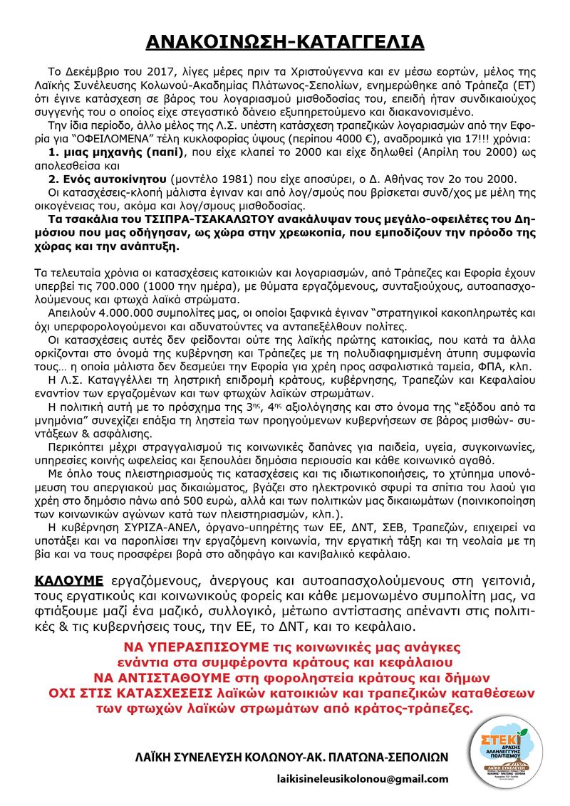 Με αφορμή αναίτιες κατασχέσεις τραπεζικών λογαρισμών δύο μελών της, η Λαϊκή Συνέλευση Κολωνού - Ακαδημίας Πλάτωνος - Σεπολίων προχώρησε σε γενικότερη καταγγελία της «ληστρικής επιδρομής κράτους - κυβέρνησης - τραπεζών και κεφαλαίου, ενάντια στους εργαζόμενους και τα φτωχά λαϊκά στρώματα».