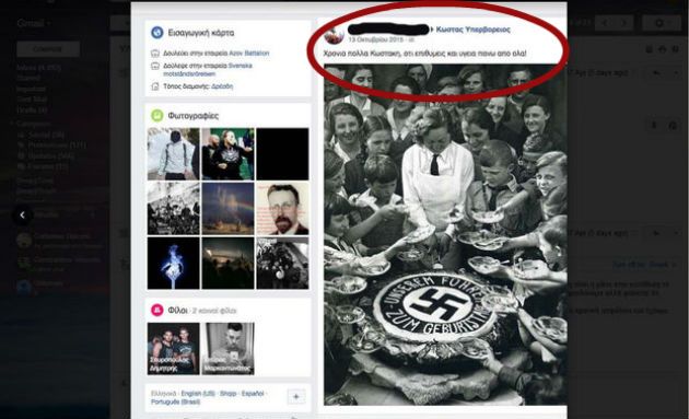 | Από το προφίλ του φερόμενου ως κουμπουροφόρου στο facebook: οι φίλοι τού εύχονται χρόνια πολλά και με υγεία με τούρτα σβάστικα της ναζιστικής νεολαίας. Ο εορτάζων απαντά υπογράφοντας με το ναζιστικό 14/88, αναφορά στο Χάιλ Χίτλερ | |