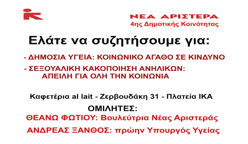 Η Νέα Αριστερά της 4ης Δημοτικής Κοινότητας διοργανώνει εκδήλωση - συζήτηση για δύο καυτά θέματα. Την δημόσια υγεία και την κακοποίηση ανηλίκων.