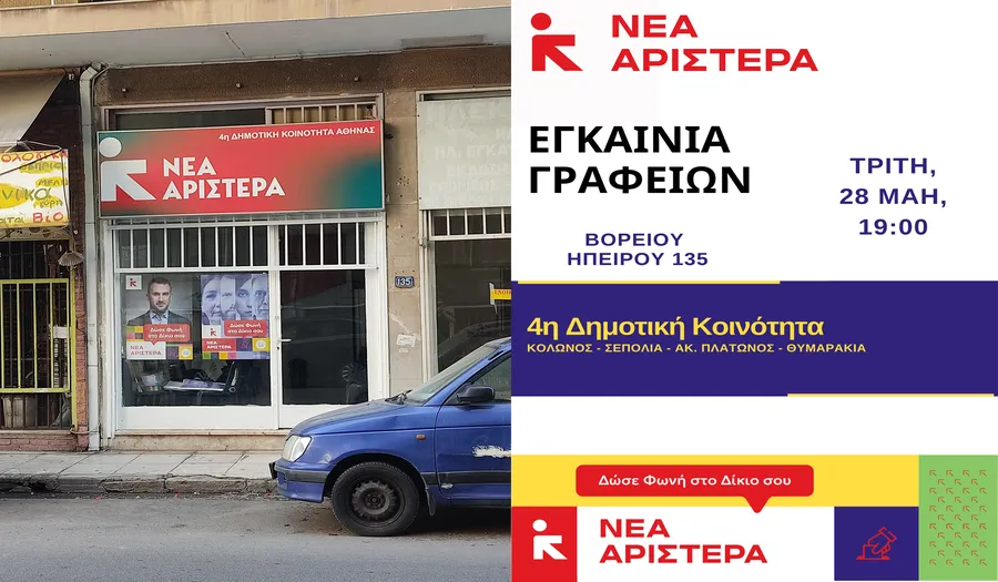 Γραφεία στα Σεπόλια - Κολωνό άνοιξε το κόμμα της Νέας Αριστεράς. Τα γραφεία βρίσκονται Βορείου Ηπείρου 135 και τα εγκαίνιά τους θα γίνουν την Τρίτη 28 Μαΐου στις 19:00.