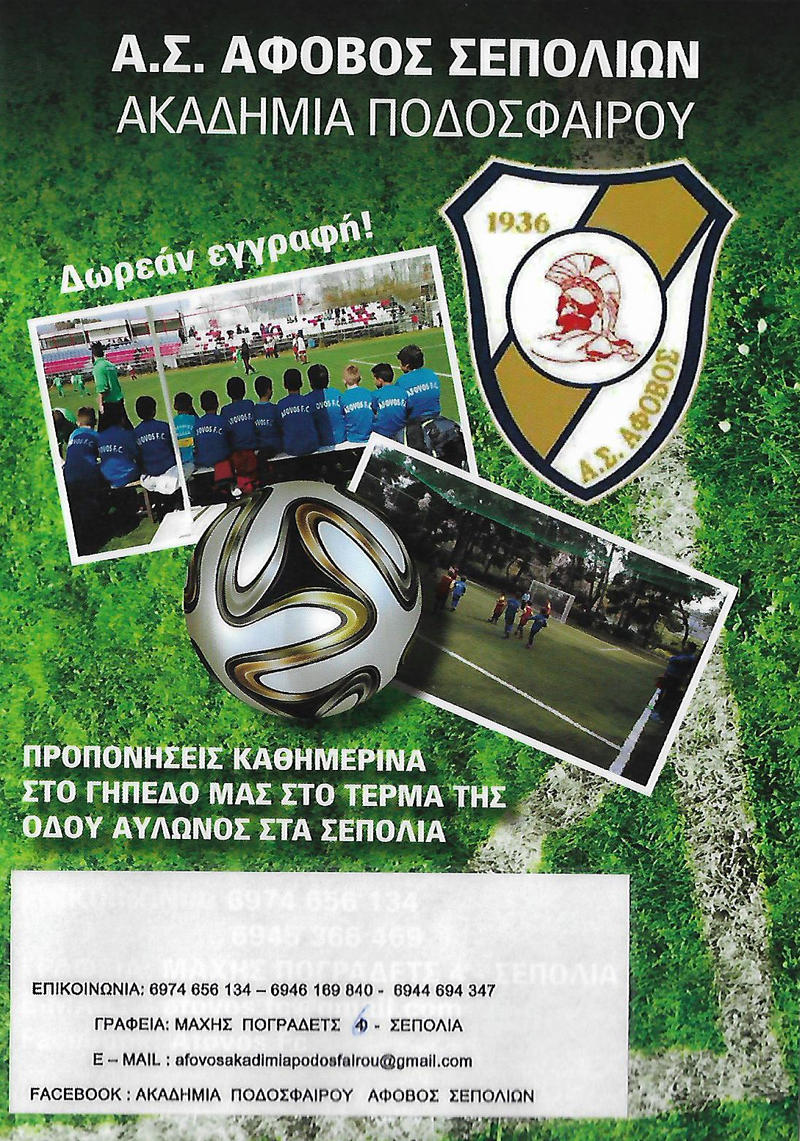 Το Δ.Σ του Αθλητικού Συλλόγου «Άφοβος» Σεπολίων, ενημερώνει ότι οι εγγραφές για τις ακαδημίες του συλλόγου ξεκίνησαν και πραγματοποιούνται στο γήπεδο που βρίσκεται Κηφισού 172 στο πάρκο.