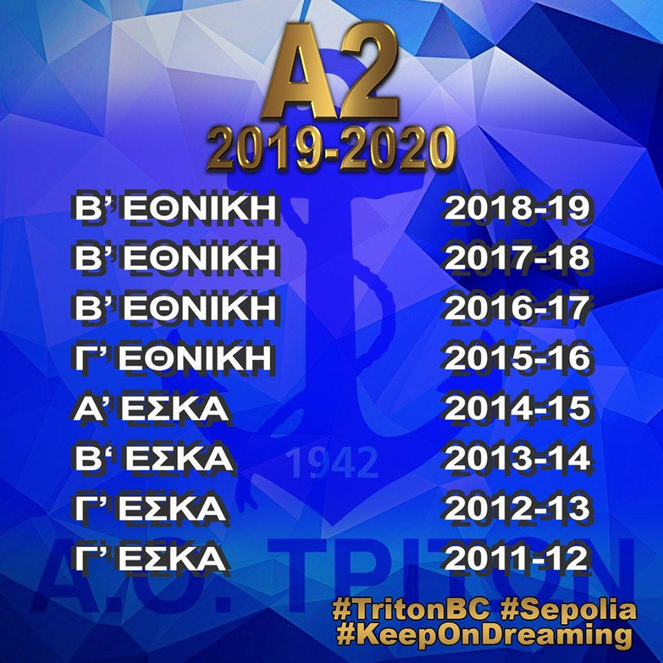 Δεν είναι όνειρο, είναι πραγματικότητα: Ξεκινώντας αυτή την τεράστια προσπάθεια πριν περίπου οχτώ χρόνια, τα όνειρά μας δεν είχαν ταβάνι, όμως ούτε εμείς οι ίδιοι μπορούσαμε να φανταστούμε που θα έφτανε η προσπάθεια αυτή! Από τα τοπικά της ΕΣΚΑ, στις Εθνικές κατηγορίες και πλέον στην Α2! Οτι και να πούμε είναι λίγο! Συγκίνηση, ανατριχίλα, περηφάνια είναι μόνο κάποιες απο τις λέξεις που ίσως περιγράφουν το πως νιώθουμε όλοι μας. Δεν υπάρχει καλύτερο συναίσθημα από το να επιβραβεύονται οι κόποι της τεράστιας προσπάθειας αυτής της «μεγάλης οικογένειας», χωρίς μεγαλομετόχους, χωρίς κρατικές ή δημοτικές επιδοτήσεις, χωρις καν γήπεδο! Οφείλουμε μόνο δύο μεγάλα «ευχαριστώ»: Το πρώτο στους αθλητές και τους προπονητές της ομάδας μας που πάλεψαν όλα αυτα τα χρόνια και έφτασαν τον Τρίτωνα στην «ελίτ των Εθνικών κατηγοριών» και το δεύτερο σε όλες και όλους τους φίλους της ομάδας από τα Σεπόλια, τον Κολωνό, τις γύρω περιοχές, αλλά και όλη την Έλλαδα που έχουν αγαπήσει αυτή την ομάδα και την στηρίζουν έμπρακτα, οικονομικά, ηθικά αλλά και με την φυσική τους παρουσία σε όλα τα γήπεδα της χώρας όλα αυτά τα χρόνια! Ο σύλλογος σε λίγες ημέρες συμπληρώνει τα 77 χρόνια ζωής και αυτή είναι ακόμα μια χρυσή σελίδα στην ιστορία του! Επόμενοι στόχοι μας, η επανισχυροποίηση των ακαδημιών μας και να παίξει η ομάδα μας επιτέλους στο κλειστό γήπεδο των Σεπολίων! Σας θέλουμε όλες και όλους δίπλα μας να δυναμώσουμε κι άλλο τον Τρίτωνα! Το οφείλουμε στις γενιές που γαλουχήθηκαν σε αυτή την ομάδα αγαπώντας το μπάσκετ και τον αθλητισμό, στην ένδοξη ιστορία μας, στις επόμενες γενιές, στα Σεπόλια μας! |
