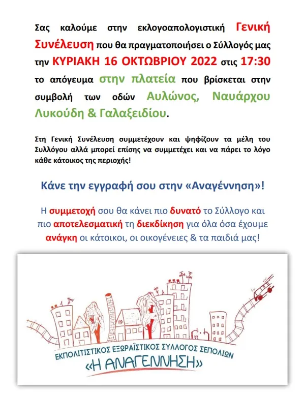 Ο Εκπολιτιστικός Εξωραϊστικός Σύλλογος Σεπολίων «Η ΑΝΑΓΕΝΝΗΣΗ» θα πραγματοποιήσει την ετήσια εκλογοαπολογιστική Γενική Συνέλευση την Κυριακή 16 Οκτωβρίου, στις 5:30 το απόγευμα στην πλατεία που βρίσκεται στη συμβολή των οδών Ναυάρχου Λυκούδη, Αυλώνος & Γαλαξειδίου.