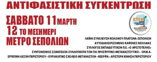 1. Να πραγματοποιηθεί το Σάββατο 11/3 στις 12 το μεσημέρι στο σταθμό Σεπολίων του Μετρό Αντιφασιστική συγκέντρωση