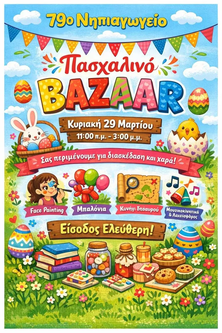 Ο σύλλογος γονέων και κηδεμόνων του 79ου Νηπιαγωγείου Αθηνών διοργανώνει μπαζαρ στο χώρο του σχολείου την Κυριακή 29/3 από 11:00πμ έως 15:00μμ με ελεύθερη είσοδο, δραστηριότητες για παιδιά και λαχειοφόρο αγορά.