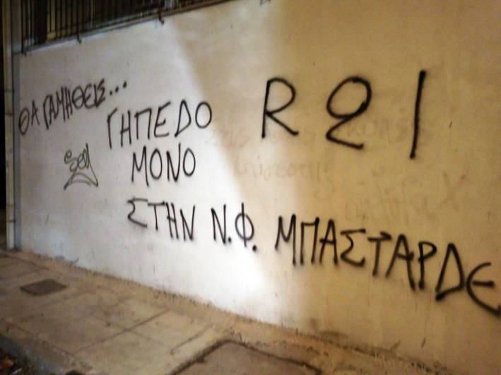 Όπως διαβάσαμε στην διαδικτυακή έκδοση της εφημερίδας «Κόντρα», το βράδυ της Παρασκευής 13 Οκτωβρίου, κάποια μηχανοκίνητη ομάδα οπαδών της ΑΕΚ, επιτέθηκε σε πολυκατοικία, όπου διαμένει ο δημοσιογράφος της εφημερίδας Γεράσιμος Λιόντος, έσπασε το τζάμι της εισόδου και έγραψε υβριστικά και απειλητικά συνθήματα εναντίον του.