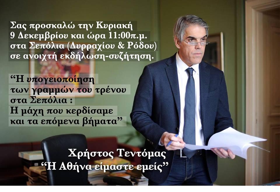 Σε ανοιχτή εκδήλωση - συζήτηση προσκαλεί τους κατοίκους των Σεπολίων ο Χρήστος Τεντόμας, επικεφαλής της παράταξης «Η Αθήνα είμαστε εμείς», την Κυριακή 9/12 στις 11 πμ στην διασταύρωση Ρόδου και Δυρραχίου, με θέμα την υπογειοποίηση των γραμμών του τρένου στα Σεπόλια.