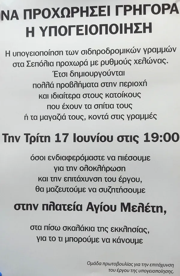 Ομάδα πρωτοβουλίας κατοίκων της περιοχής καλεί την Τρίτη 17/6 στις 19:00 στην πλατεία Αγίου Μελετίου, όσους κατοίκους ενδιαφέρονται για το θέμα, να μαζευτούν και να συζητήσουν πως μπορεί να ασκηθεί πίεση για την επιτάχυνση του έργου της υπογειοποίησης των σιδηροδρομικών γραμμών.