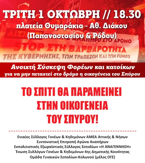 Ο εκπολιτιστικός εξωραϊστικός σύλλογος Η ΑΝΑΓΕΝΝΗΣΗ και άλλοι φορείς, καλούν σήμερα 1 Οκτωβρίου σε συγκέντρωση - συζήτηση στην πλατεία στα Θυμαράκια στις 6:30 μμ για να μην πεταχτεί στο δρόμο η οικογένεια του Σπύρου.